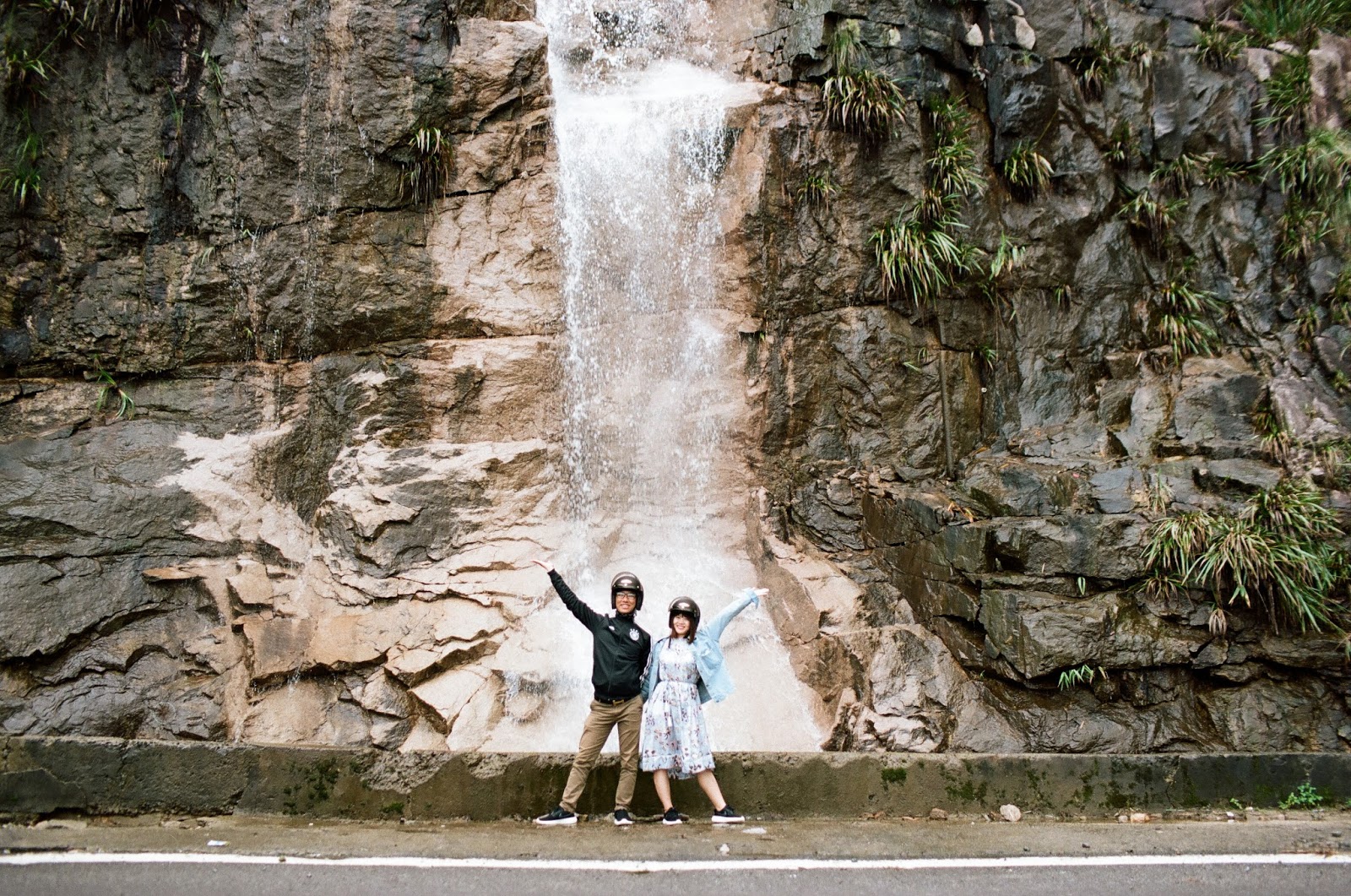 Đoạn này là đoạn độ cao 1500m trên đèo Khánh Vĩnh, sương mù mịt chỉ thấy được vài mét trước mặt. Mình lấy nét trước rồi kêu Hùng và Nhung chạy tới nhưng cũng hơi run vì không biết đo sáng trong tình huống này thế nào với sợ out nét. May mà tráng film ra ảnh không bị sao 🙂