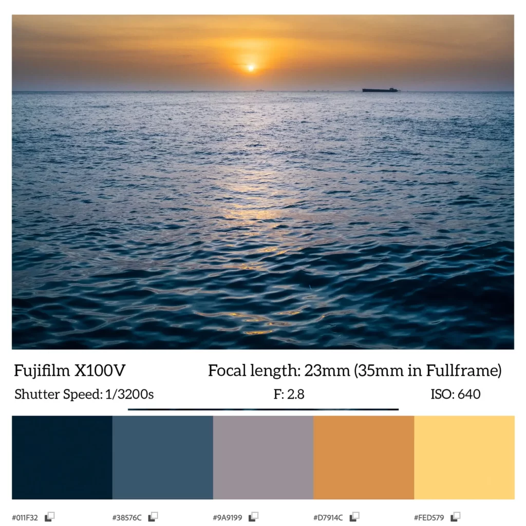 Màu sắc: phía chân trời có nhiều mây mỏng nên ánh sáng mặt trời được tản dịu hơn nên có thể nhìn rõ quả cầu lửa màu cam, ánh sắc cam lên bầu trời, mây mỏng và trên mặt nước. Phía dưới nước đã bắt đầu tối nên chỉ còn sắc xanh thẳm của biển vào cuối ngày. Tương phản màu nước và màu mặt trời nên tạo cảm giác ấn tượng. Màu xanh thẳm của biển tạo cảm giác mát lạnh, còn màu cam vàng của mặt trời tạo cảm giác ấm áp lại nhưng do màu xanh thẳm chiếm phần lớn khuôn ảnh nên cảm giác chủ đạo vẫn là cảm giác mát lạnh.