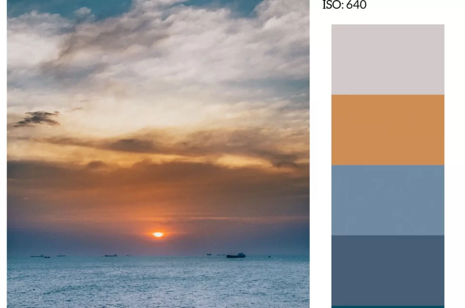 Màu sắc: phía chân trời có nhiều mây mỏng nên ánh sáng mặt trời được tản dịu hơn nên có thể nhìn rõ quả cầu lửa màu cam, ánh sắc cam lên bầu trời, mây mỏng và trên mặt nước. Phía dưới nước đã bắt đầu tối nên chỉ còn sắc xanh thẳm của biển vào cuối ngày. Tương phản màu nước và màu mặt trời nên tạo cảm giác ấn tượng. Màu xanh thẳm của biển tạo cảm giác mát lạnh, còn màu cam vàng của mặt trời tạo cảm giác ấm áp lại nhưng do màu xanh thẳm chiếm phần lớn khuôn ảnh nên cảm giác chủ đạo vẫn là cảm giác mát lạnh.